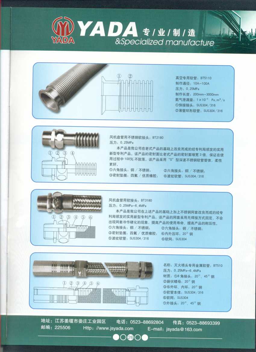 秉天時(shí) 籍地利 仰人和 虔誠(chéng)一個(gè)永恒的理念,創(chuàng)新永續(xù).百諾不如一信,亞達(dá)人堅(jiān)持以信為本,視客戶如同上帝,把對(duì)信譽(yù)的追求,體現(xiàn)在嚴(yán)格的質(zhì)量控制和完善的客戶服務(wù)上,讓客戶百分之百滿意是亞達(dá)人不變的信念。 本廠系ISO9001質(zhì)量認(rèn)證企業(yè)、計(jì)量合格企業(yè)。本廠專業(yè)致力于生產(chǎn)不銹鋼金屬波紋軟管、超高壓、高壓膠管、波紋管補(bǔ)償器(膨脹節(jié))、立式、臥式、冷卻器。本廠產(chǎn)品具有承受壓力高、彎曲半徑小、抗疲勞性能強(qiáng)、使用壽命長(zhǎng)等特點(diǎn)。廣泛應(yīng)用于電力、石化、冶金、水泥建材、工程機(jī)械、礦山及液壓系統(tǒng)。產(chǎn)品暢銷全國(guó)各地。 今日亞達(dá)之成功源自諸多客戶的厚愛(ài),明天的輝煌更離不開您對(duì)我的支持與信賴。查看更多>>